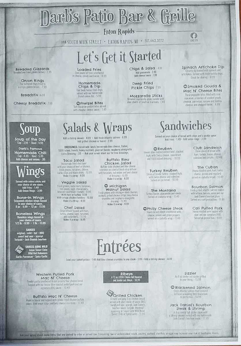 The overall feel of the menu and space invites visitors to enjoy uncomplicated food and drinks in a comfortable, unpretentious setting—an ideal spot for everyday relaxed dining in Eaton Rapids.